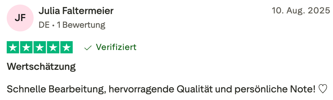 Ich möchte auch einen echten Beitrag leisten. Deshalb spende ich 10% jeder Bestellung an Frauenhäuser und Initiativen zur Prävention von Gewalt gegen Frauen.